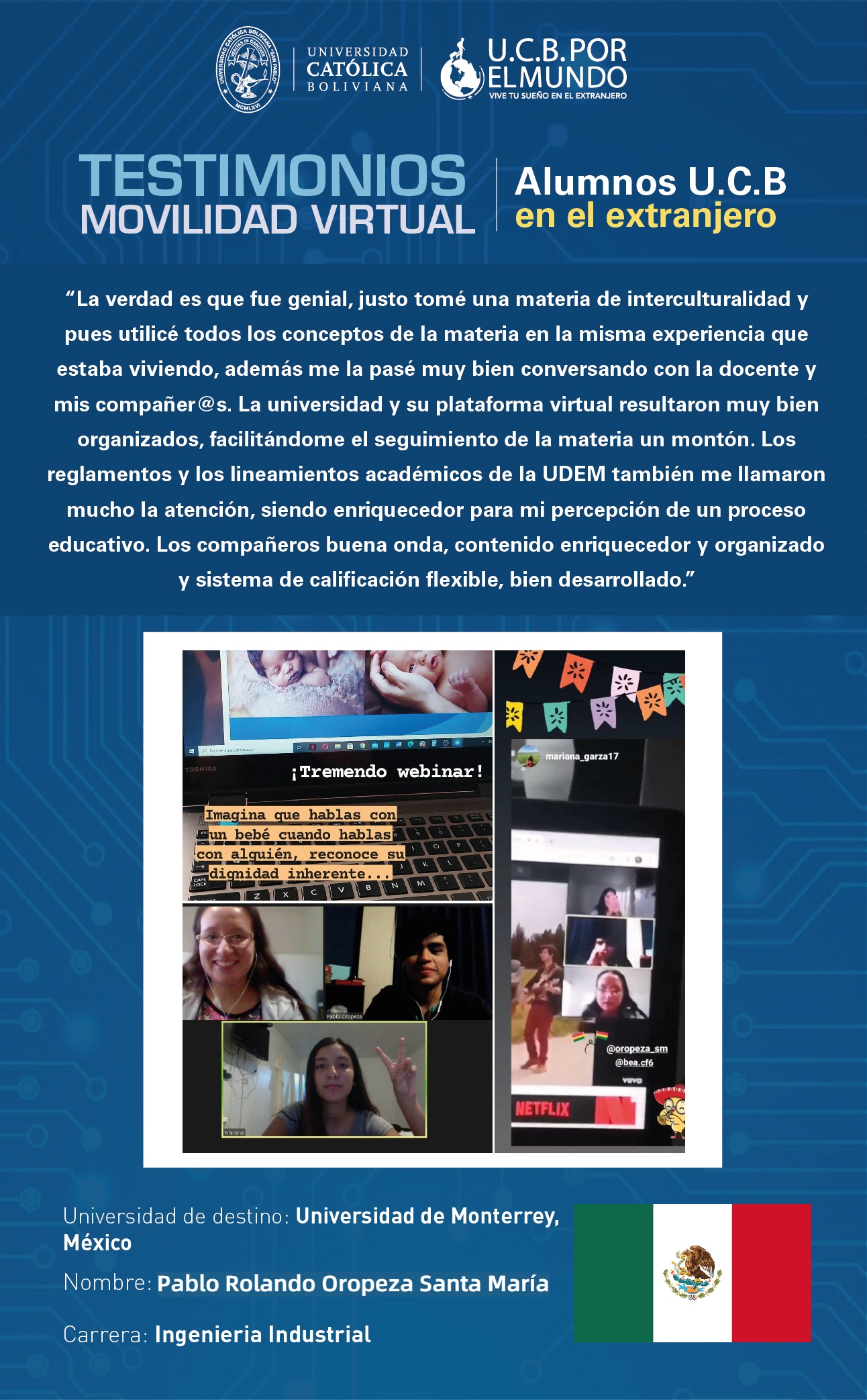 Te invitamos a leer el testimonio de nuestro estudiante Pablo Oropeza que participó de la movilidad en la Universidad de Monterrey de México.