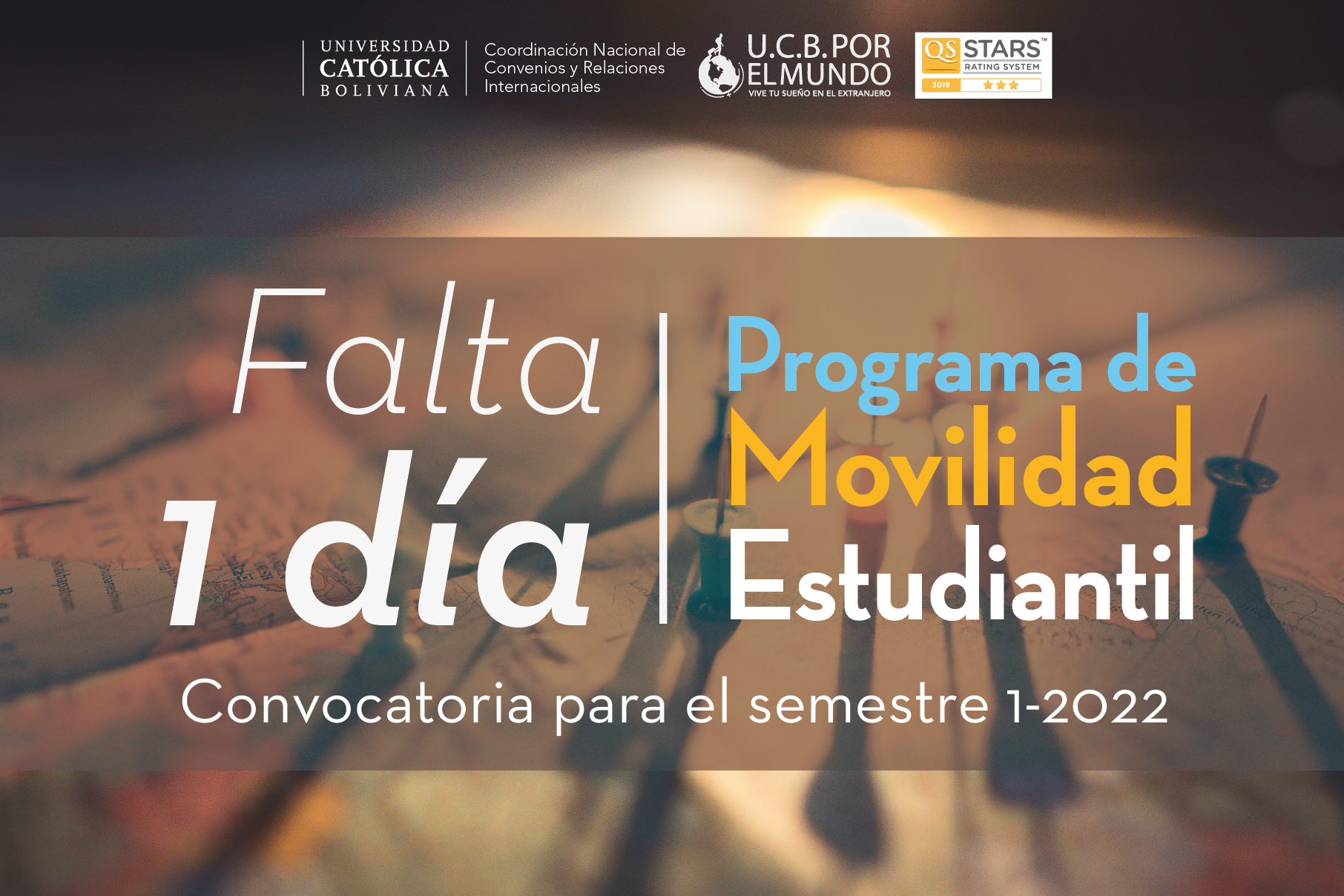 ¡ATENCIÓN ESTUDIANTES UCB! Mañana viernes 20 de agosto publicaremos la convocatoria del Programa de Movilidad Estudiantil UCB por el Mundo para el Semestre 1-2022. Volver atras ¡ATENCIÓN ESTUDIANTES UCB! Mañana viernes 20 de agosto publicaremos la convocatoria del Programa de Movilidad Estudiantil UCB por el Mundo para el Semestre 1-2022.