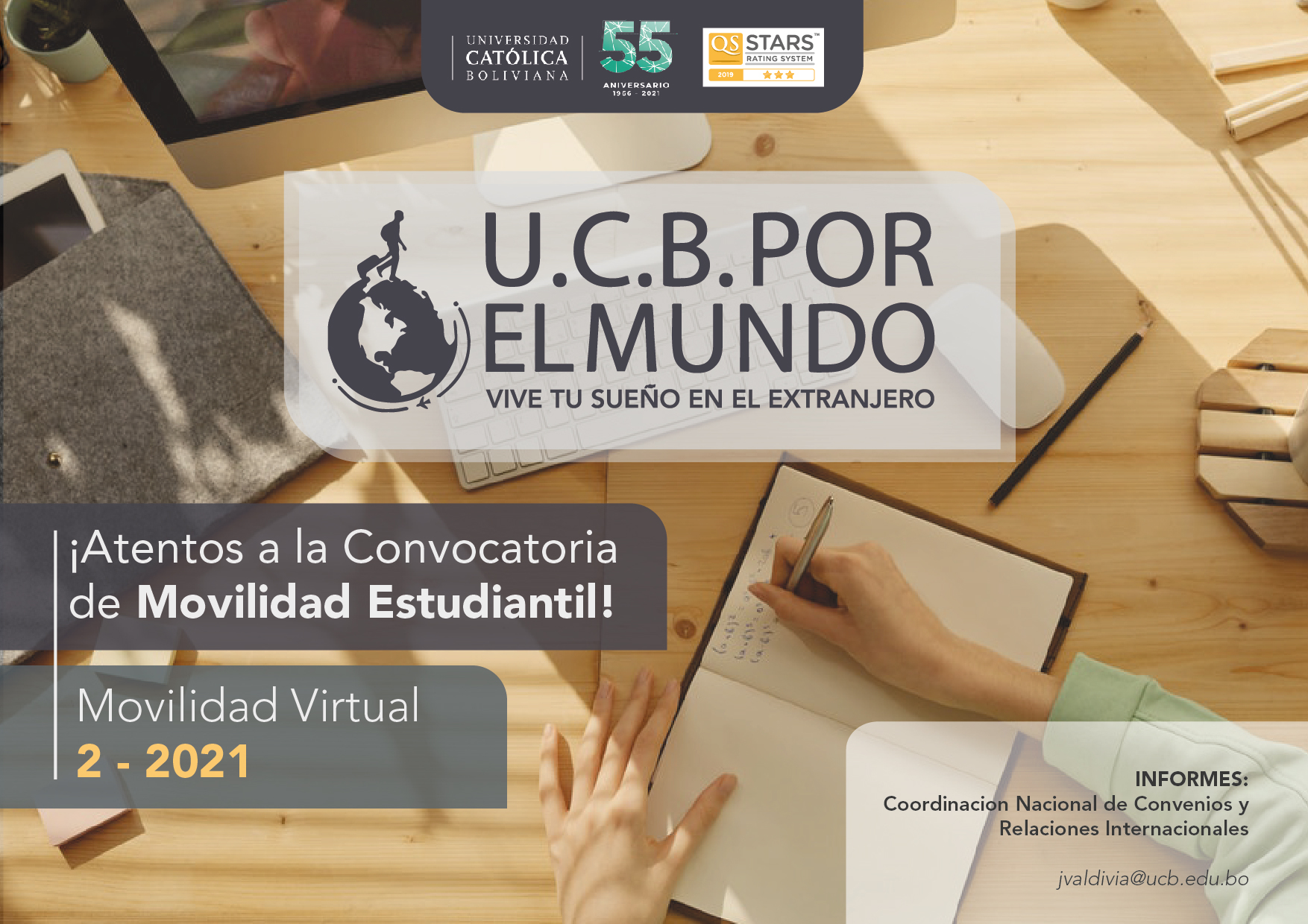 ATENTOS ESTUDIANTES UCB – Convocatoria del Programa de Movilidad Virtual Estudiantil UCB Volver atras ATENTOS ESTUDIANTES UCB La Convocatoria del Programa de Movilidad Virtual Estudiantil UCB por el Mundo para el semestre 2-2021 se publicará el día de mañana martes 1 de junio. Anímate a tener una experiencia internacional.