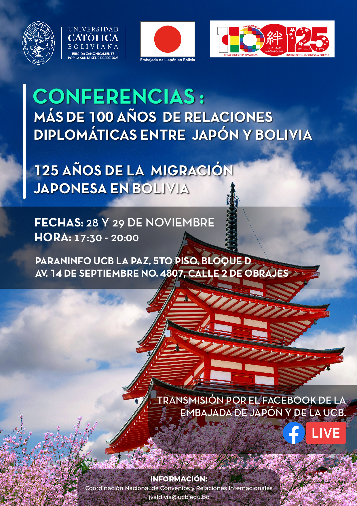 La Embajada del Japón en Bolivia y la Universidad Católica Boliviana San Pablo te invitan al Ciclo de Conferencias: “Más de 100 años de relaciones diplomáticas entre Japón y Bolivia y 125 años de la migración japonesa en Bolivia”