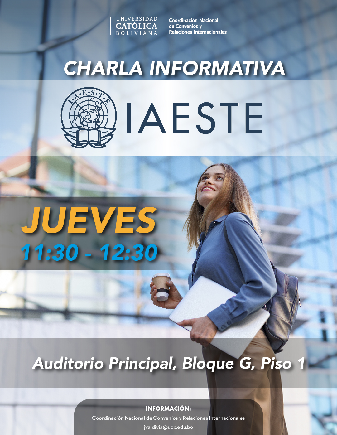 Charla informativa de las Pasantías Internacionales de IAESTE Volver atras Charla informativa de las Pasantías Internacionales de IAESTE Día: Jueves 07.03.2024 Hrs. 11:30 – 12:30 Lugar: Auditorio Principal UCB, Bloque G, Piso 1