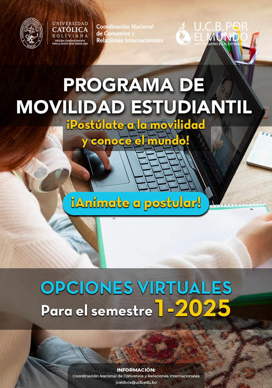 ¡Convocatoria abierta! ¡El Programa Virtual de Movilidad Estudiantil UCB por el Mundo para el primer semestre de 2025 ya está abierto! Volver atras ¡Convocatoria abierta! ¡El Programa Virtual de Movilidad Estudiantil UCB por el Mundo para el primer semestre de 2025 yá está abierto! Si eres estudiante de la UCB en cualquier campus a nivel nacional, ¡esta es tu oportunidad para explorar el mundo desde casa! Revisa la convocatoria aquí: http://l.ead.me/PMEUCBPORELMUNDO Postula en el siguiente enlace: https://forms.gle/ri4pKnrNrwtna48k9 Contacto por WhatsApp: https://wa.me/qr/VNGOOAEHEBMIG1 Para más detalles: https://internacional.ucb.edu.bo/ https://www.facebook.com/profile.php?id=100057765245636 https://youtube.com/channel/UC3VrNtVo4qy3salbxtO7OAw ¡Anímate a vivir esta experiencia global sin salir del país! Programa abierto a nivel nacional