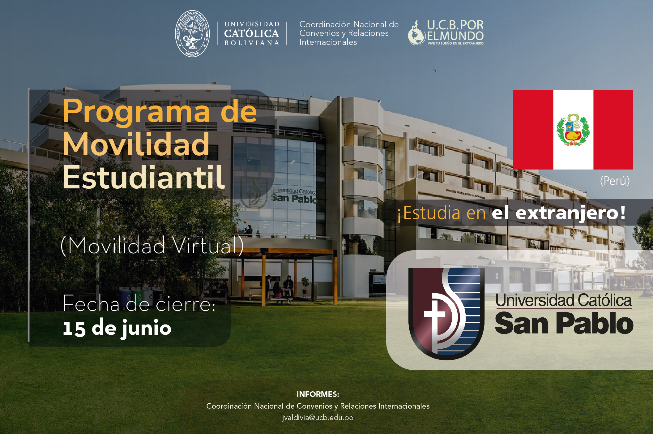 El Programa de Movilidad Estudiantil UCB por el Mundo cuenta con cupos en la Universidad Católica San Pablo de Perú.