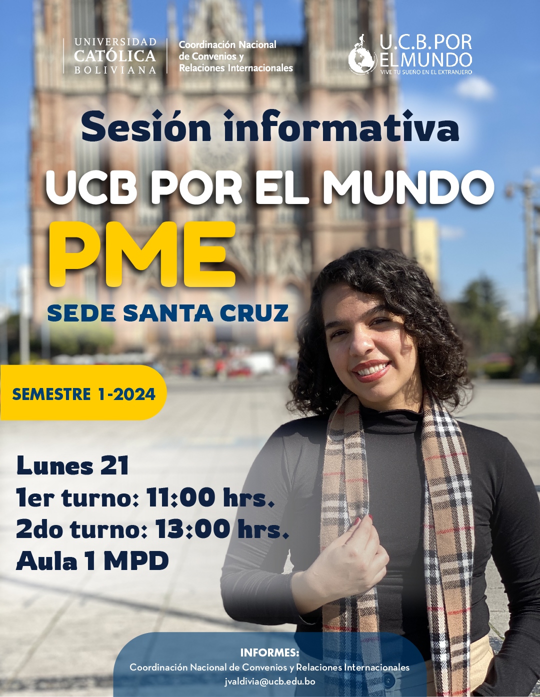 La sesión informativa en Santa Cruz se realizará el lunes 21 de agosto en un primer turno a las 11:00 am y en un segundo turno a la 13:00 de forma presencial en el Auditorio 1 bloque MpD, Km. 9 sede Universidad Católica – UCB Santa Cruz.