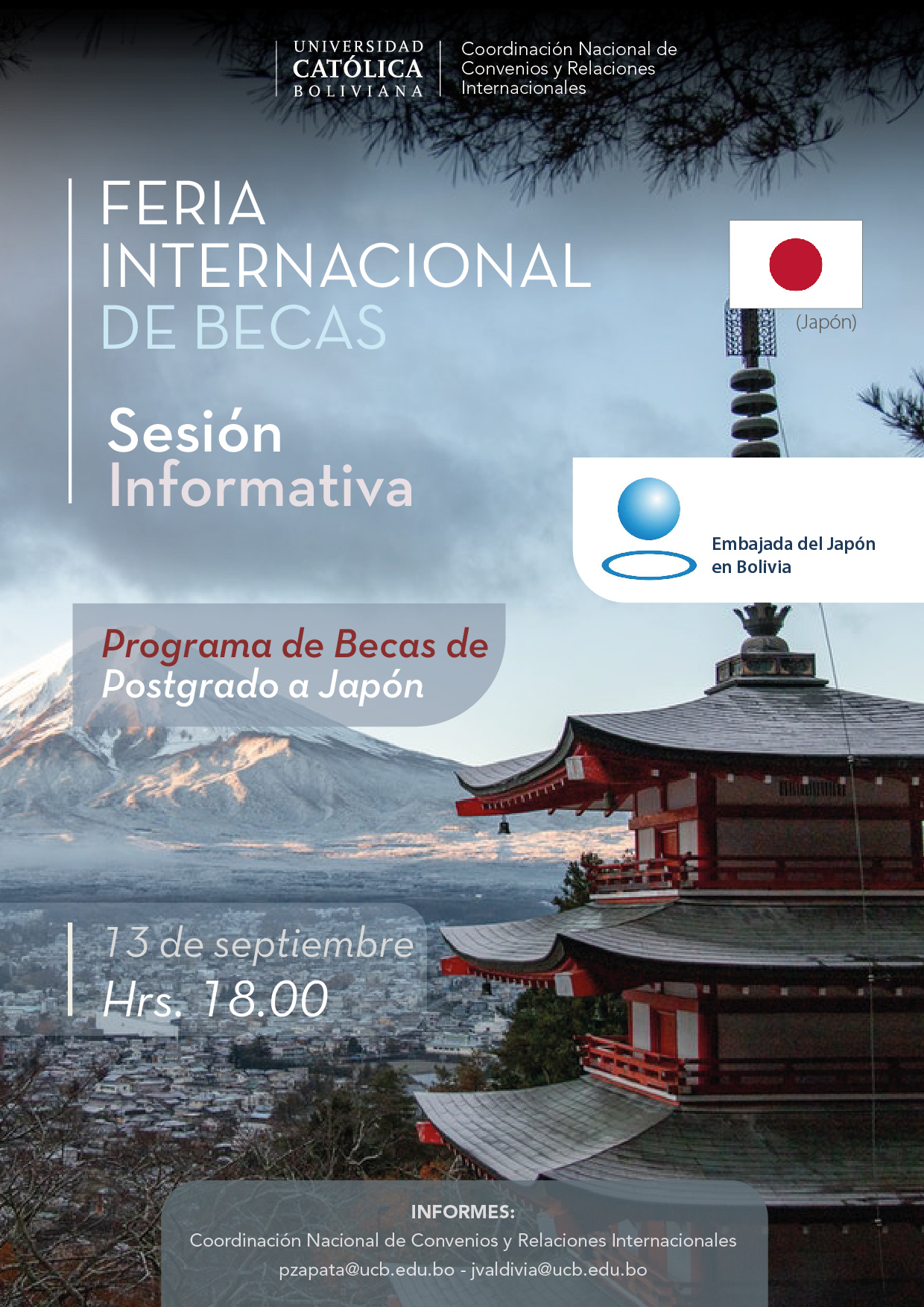 Feria Internacional de Becas de Postgrado, 5ta Sesión Informativa Programa de Becas a Japón Volver atras Hoy lunes 13 de septiembre tendremos la 5ta Sesión Informativa de la Feria Internacional de Becas de Postgrado en esta ocasión podrás conocer los pasos para postular al Programa de Becas de Postgrado a Japón.