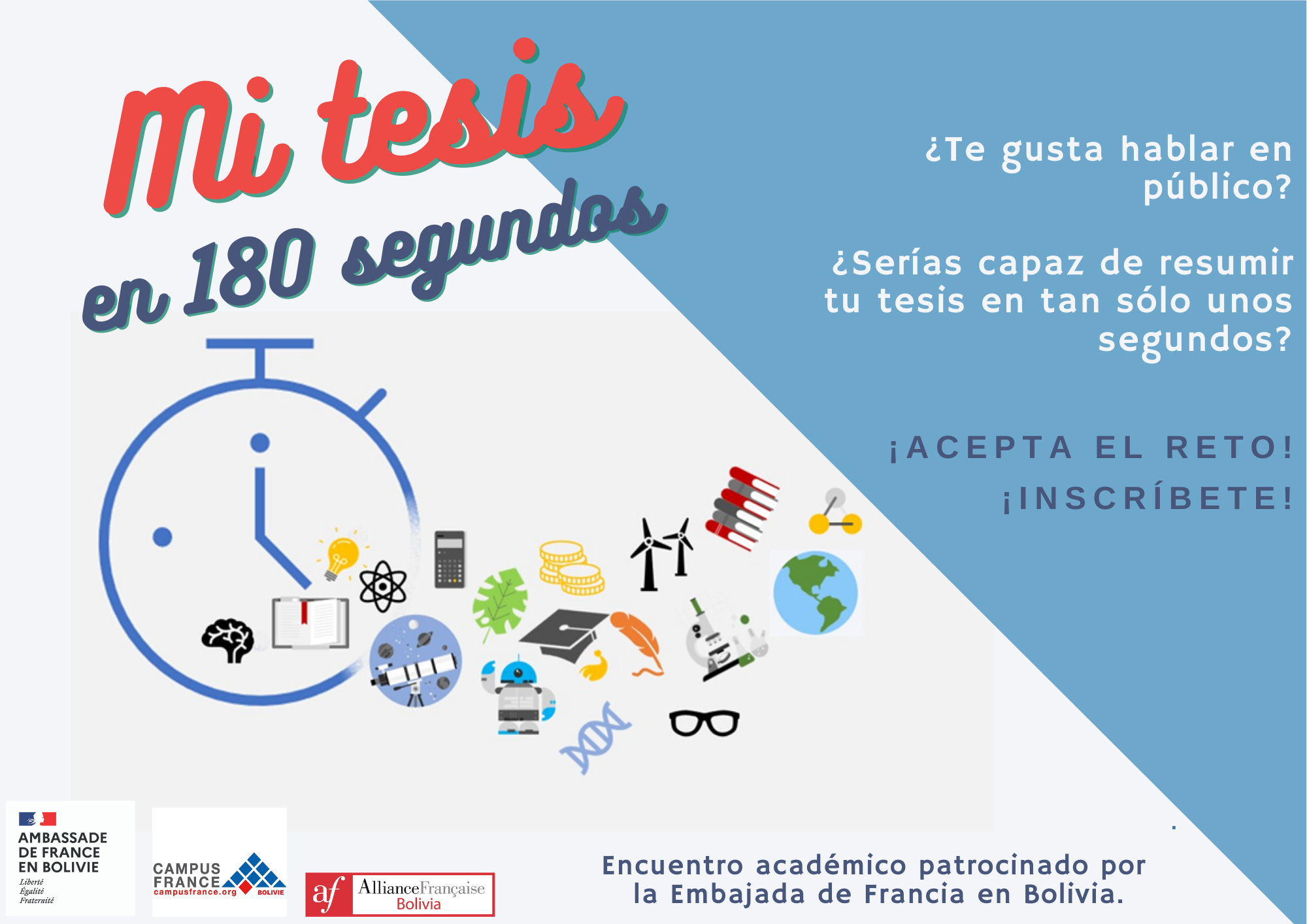 El Servicio de cooperación y de acción cultural de la Embajada de Francia en Bolivia, es un placer anunciarles el lanzamiento del proyecto “Mi Tesis en 180 segundos”. Dicho proyecto es un encuentro académico que se llevará a cabo durante los próximos meses en el cuál jóvenes profesionales bolivianos tendrán la oportunidad de realizar una presentación oral, en castellano, de su tesis de licenciatura en 180 segundos, frente a un jurado.