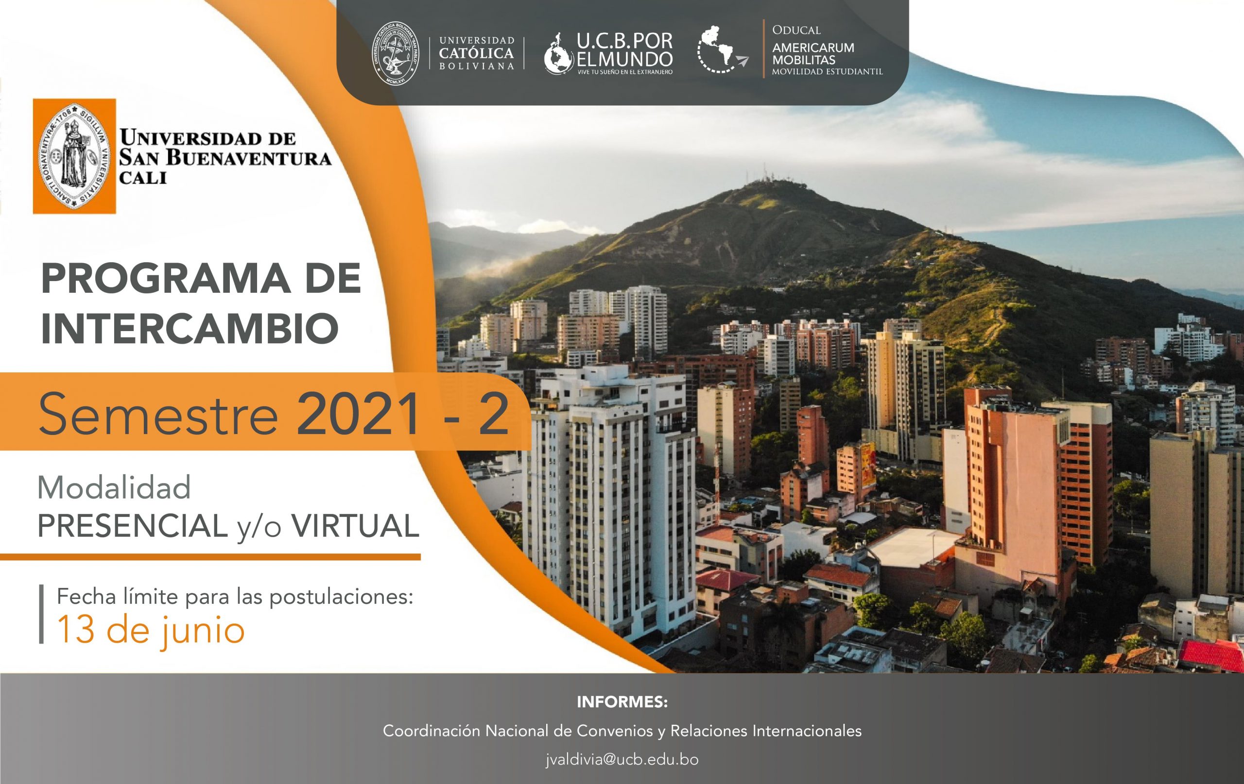 La Universidad de San Buenaventura CALI es parte del Programa de Movilidad Estudiantil UCB por el Mundo y ofrece clases en la modalidad Presencial y/o Virtual.