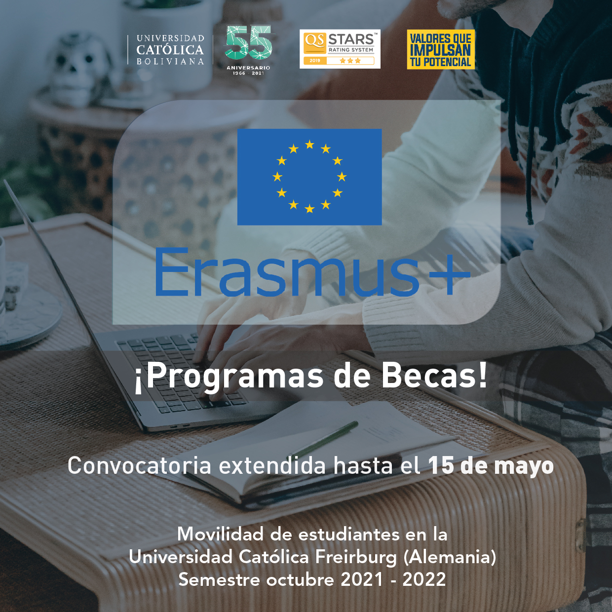Programa de Becas ERASMUS+ para la movilidad de estudiantes en la Universidad Católica de Freiburgo en Alemania. Volver atras ÚLTIMOS DÍAS PARA POSTULAR Convocatoria extendida hasta el 15 de mayo Programa de Becas ERASMUS+ abre la convocatoria para la movilidad de estudiantes en la Universidad Católica de Freiburgo en Alemania. Te invitamos a revisar los detalles de la convocatoria: https://bit.ly/3gF2inb