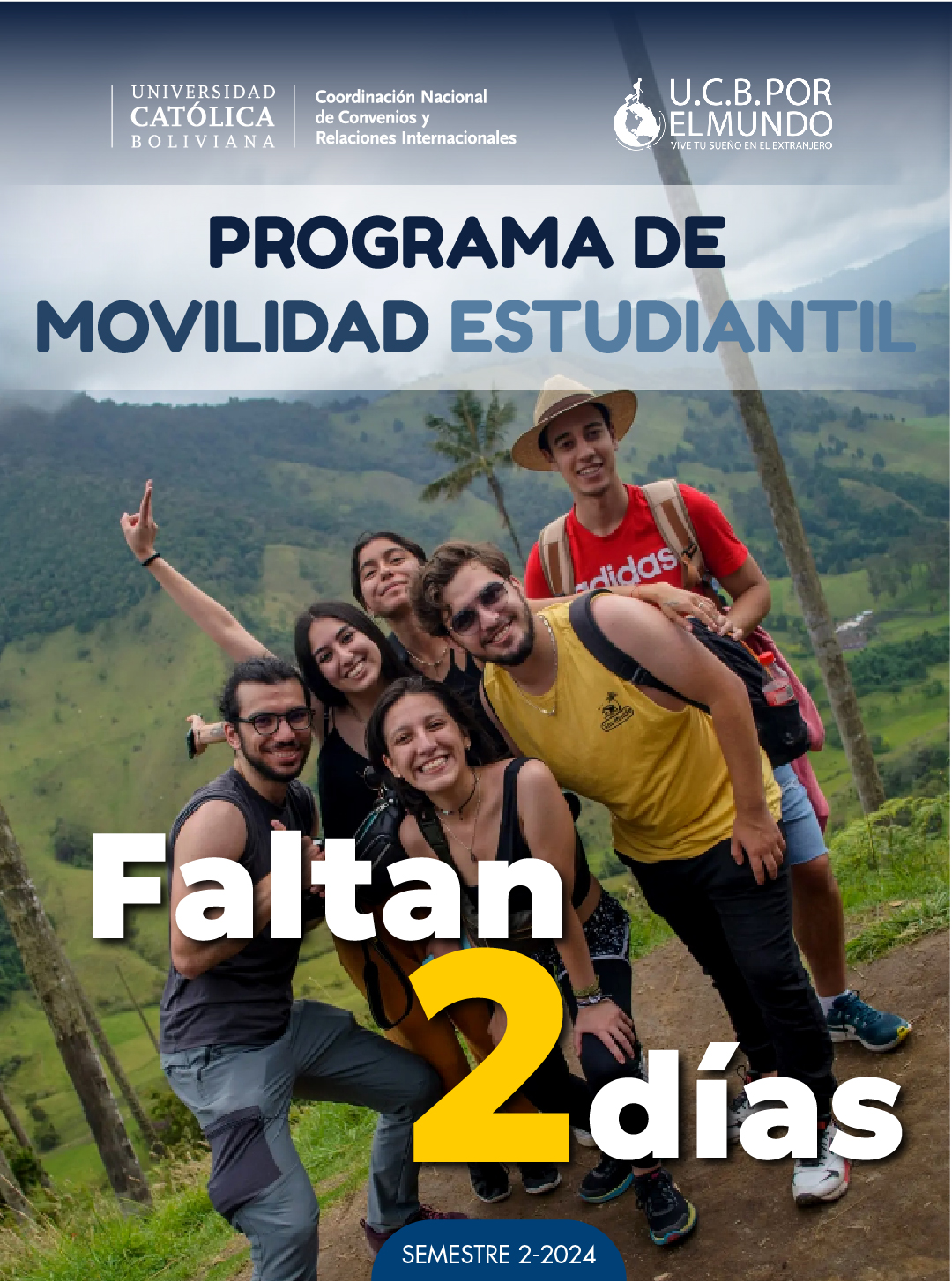 Programa de Movilidad Estudiantil UCB por el Mundo Volver atras ¡ATENCIÓN ESTUDIANTES UCB y Epc! Faltan 2 días para la publicación de la convocatoria del Programa de Movilidad Estudiantil UCB por el Mundo para el Semestre 2-2024. ¡La convocatoria estará disponible desde este viernes 9 de febrero!