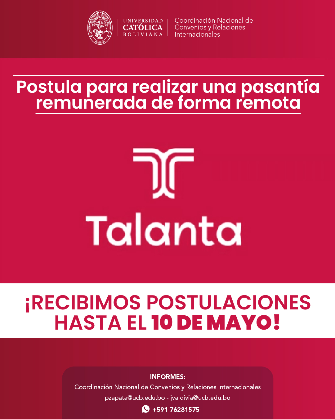 PROGRAMA TALANTA – Interesante oportunidad de pasantía internacional Volver atras PROGRAMA TALANTA Interesante oportunidad de pasantía internacional Fecha de cierre: 10 de mayo. Formulario de postulación: https://forms.gle/8nEDpr2R7PbCbawu7 Para más información revisa su página web: https://www.talanta.com/