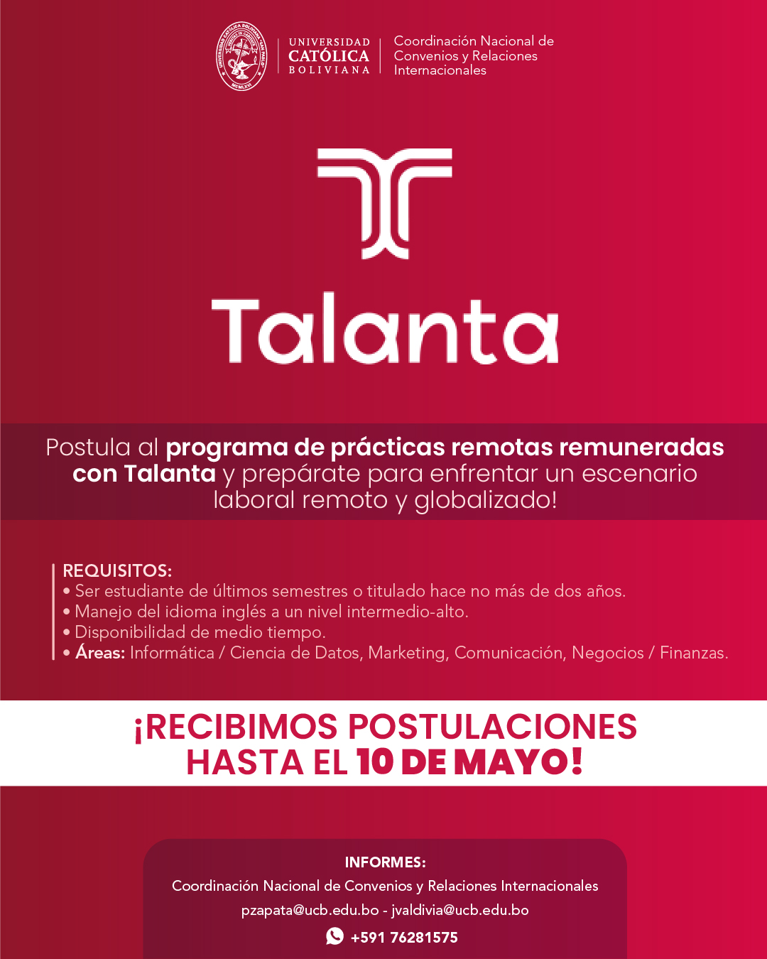 PROGRAMA TALANTA Interesante oportunidad de pasantía remota internacional Volver atras PROGRAMA TALANTA Interesante oportunidad de pasantía remota internacional Fecha de cierre: 10 de mayo. Formulario de postulación: https://forms.gle/8nEDpr2R7PbCbawu7 Para más información revisa su página web: https://www.talanta.com/