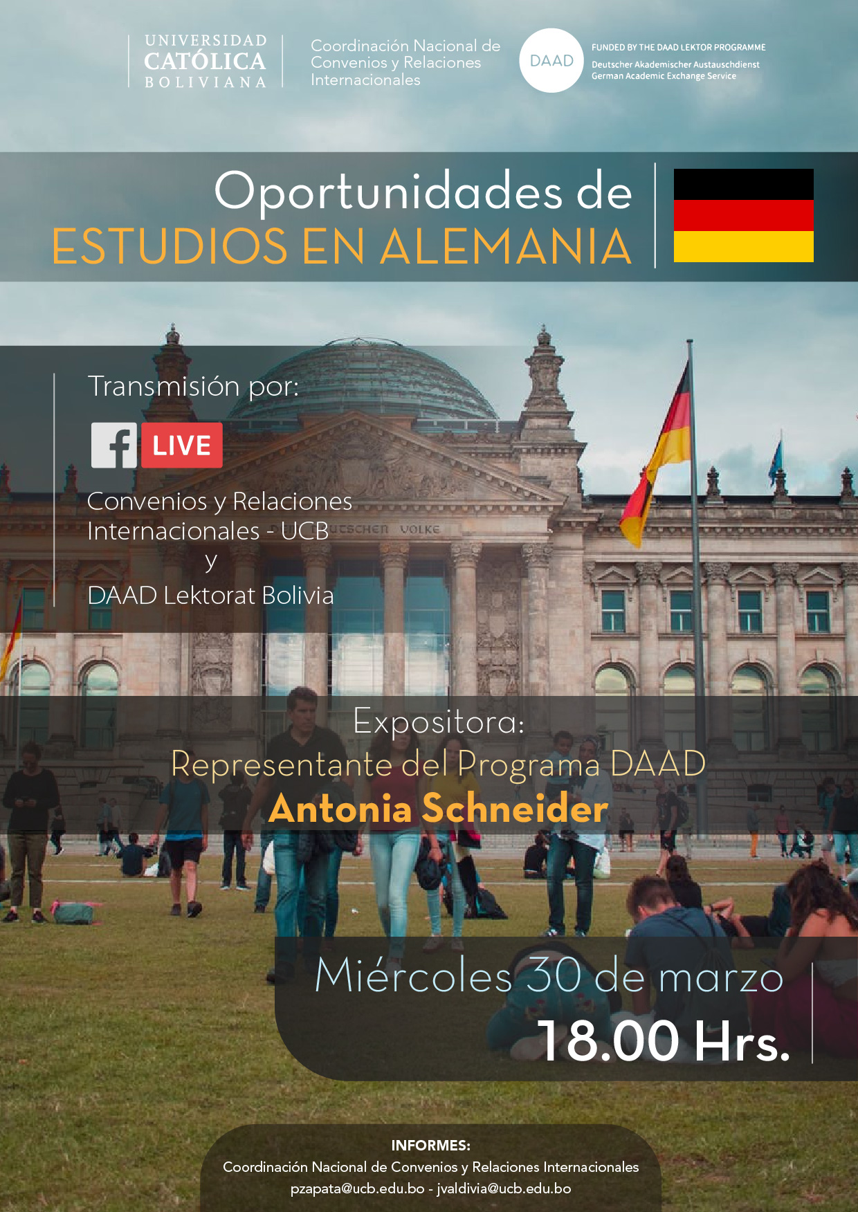 La Universidad Católica Boliviana “San Pablo” conjunto el Servicio Alemán de Intercambio Académico están organizando la sesión informativa de oportunidades de estudio en Alemania a realizarse el día miércoles 30 de marzo a horas 18:00 por nuestro canal de Facebook: https://fb.me/e/2kSOXplXC