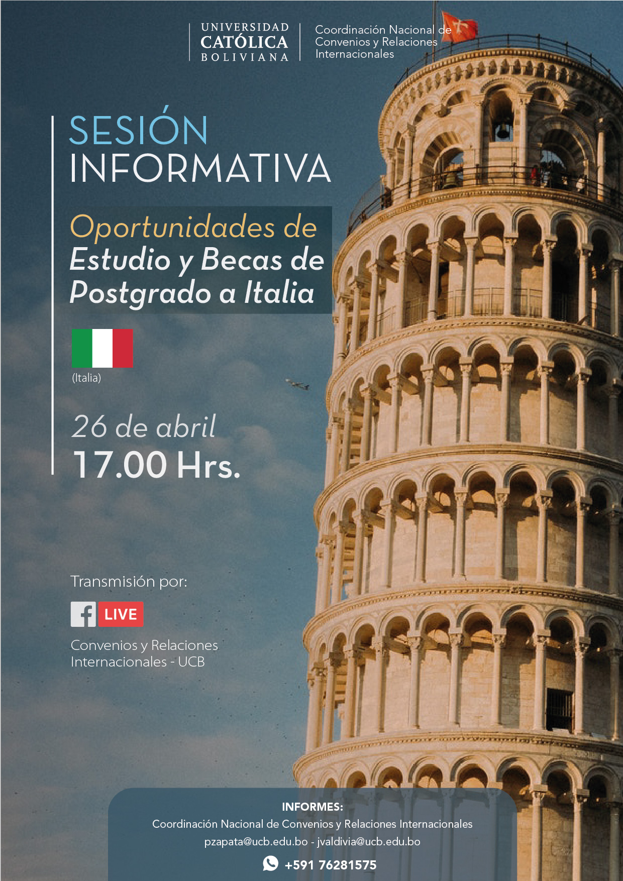 La Universidad Católica Boliviana “San Pablo” se complace en invitarlos a la Sesión informativa oportunidades de estudio y becas de postgrado en Italia.