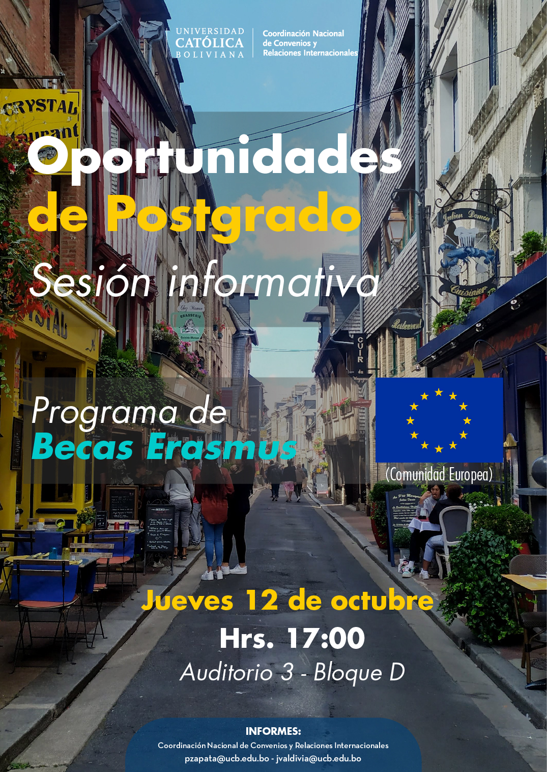 La Delegación del Programa de la Unión Europea conjunto la Universidad Católica Boliviana “San Pablo” están organizando la charla informativa de becas para estudiantes, doctorandos, profesores y personal de las instituciones de educación superior.