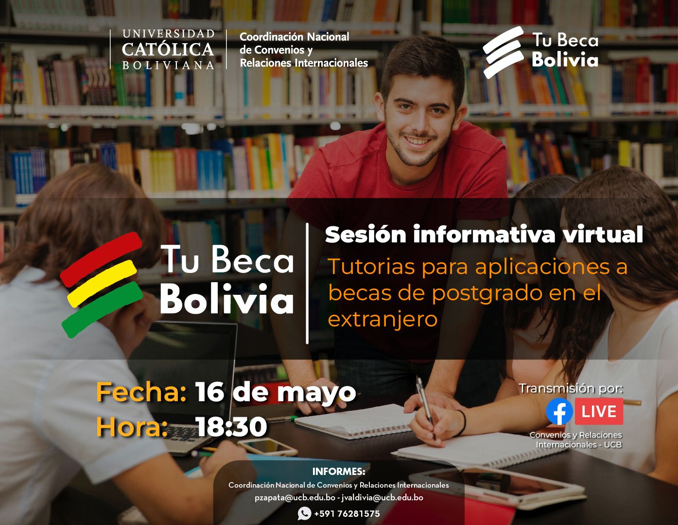 La Universidad Católica Boliviana “San Pablo” conjunto el Programa TU BECA BOLIVIA se complace en invitarlos a la Sesión informativa virtual “Tutorías para aplicaciones a becas de postgrado en el extranjero”.