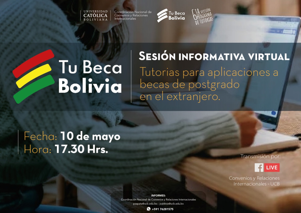La Universidad Católica Boliviana “San Pablo” conjunto el Programa TU BECA BOLIVIA se complace en invitarlos a la Sesión informativa virtual “Tutorías para aplicaciones a becas de postgrado en el extranjero”.
