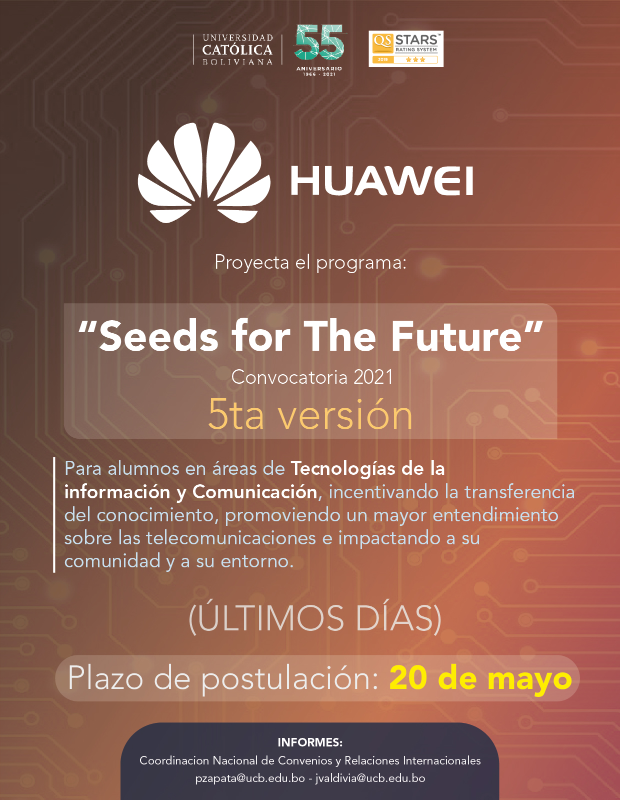 ÚLTIMOS DÍAS PARA POSTULAR Huawei abre la Convocatoria 2021 del Programa “SEEDS FOR THE FUTURE” Volver atras ÚLTIMOS DÍAS PARA POSTULAR Huawei abre la Convocatoria 2021 del Programa “SEEDS FOR THE FUTURE” Plazo límite de postulación: 20 de mayo Más información: https://drive.google.com/…/10ZuY…/view…